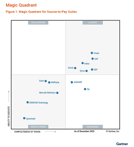 Clark, N.J., Jan. 23, 2026 – GEP®, a leading provider of AI-powered procurement and supply chain software for Fortune 500 and Global 2000 enterprises worldwide, today announced that Gartner has positioned GEP as a Leader in the 2026 Gartner Magic Quadrant for Source-to-Pay Suites, for the second consecutive year. Vendors were evaluated based on specific criteria analyzing overall Completeness of Vision and Ability to Execute. A complimentary copy of the 2026 Gartner Magic Quadrant for Source-to-Pay Suites is available for download HERE.
