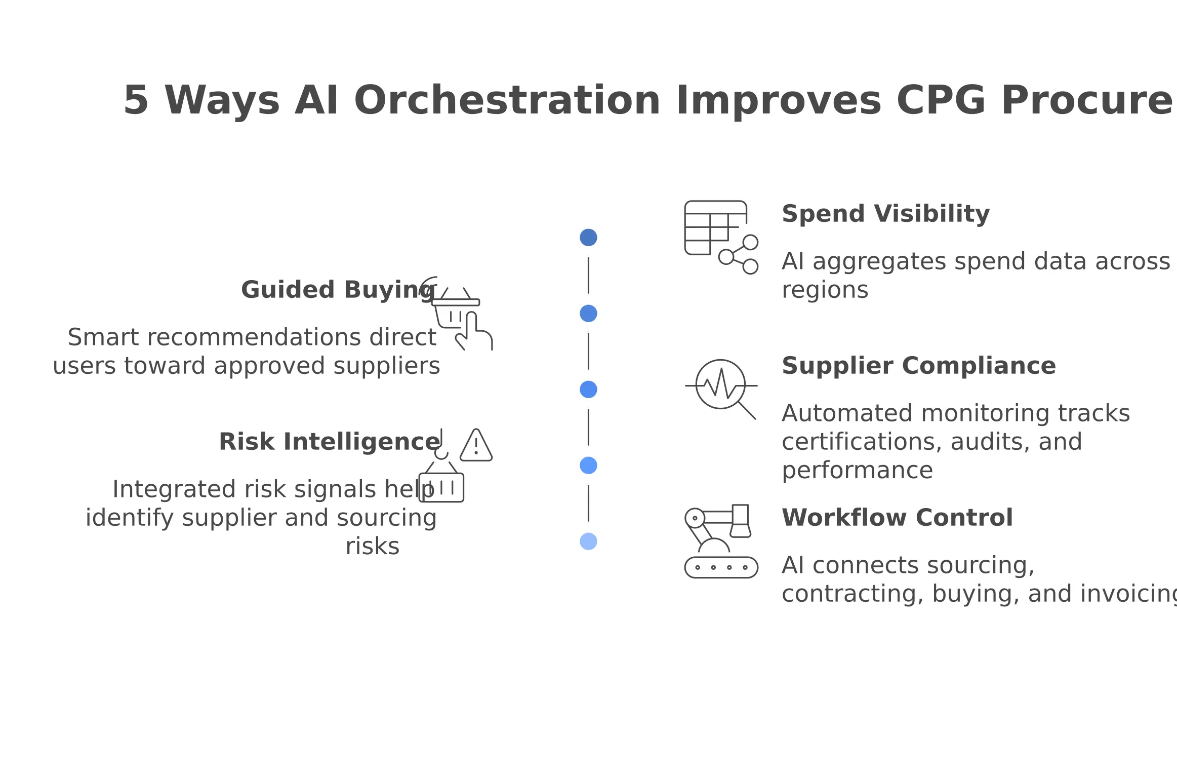 Benefits include real-time spend visibility, reduced maverick spend, improved supplier compliance management, enhanced risk mitigation, faster sourcing cycles, and greater procurement efficiency. Ultimately, AI-driven orchestration helps CPG companies achieve cost control while strengthening governance and resilience.