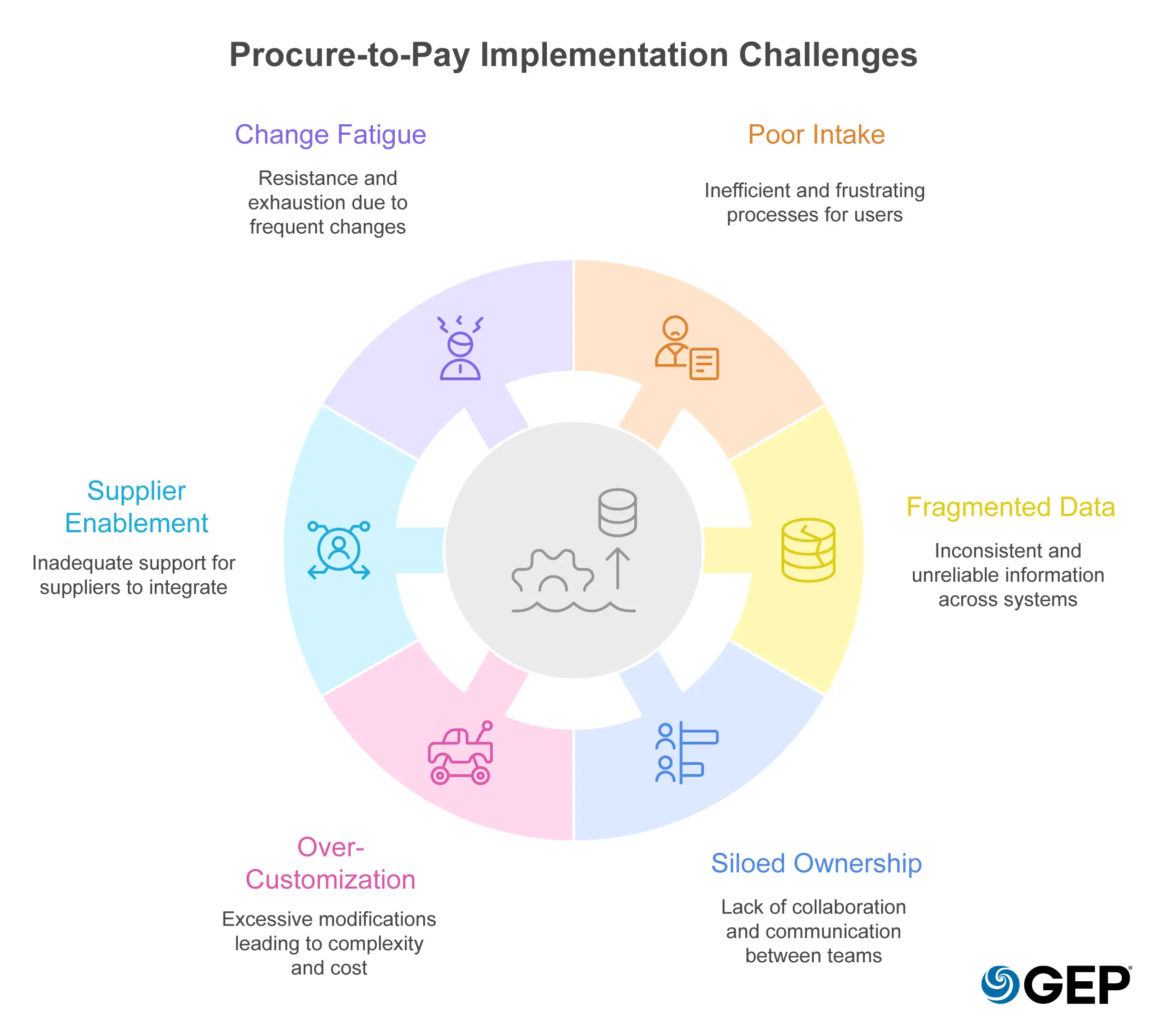 This slows decisions. Approvals bounce between functions. Policy exceptions pile up. GEP studies consistently show that lack of cross-functional ownership delays P2P stabilization more than technical issues.