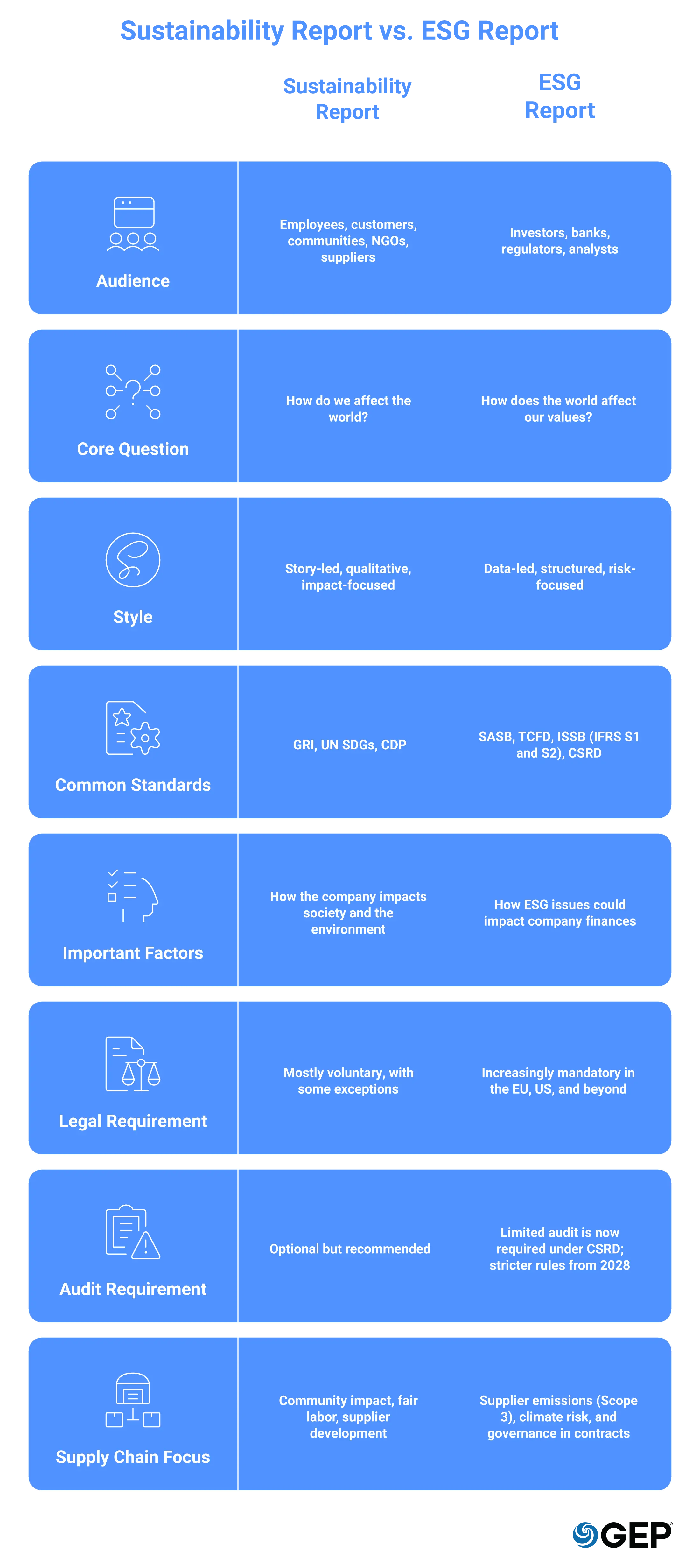 An ESG report and a sustainability report are two different documents created for different audiences. They provide distinct answers, fulfil distinct purposes, and increasingly have distinct legal obligations. Auditors, investors, and regulators will discover gaps if they are treated as interchangeable.