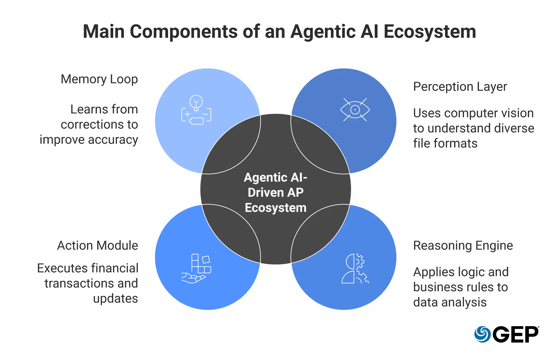 The Action Module (The Hands): This layer talks to your ERP, banks, and email. It actually posts the entries, schedules the payments, and hits "send" on vendor updates.