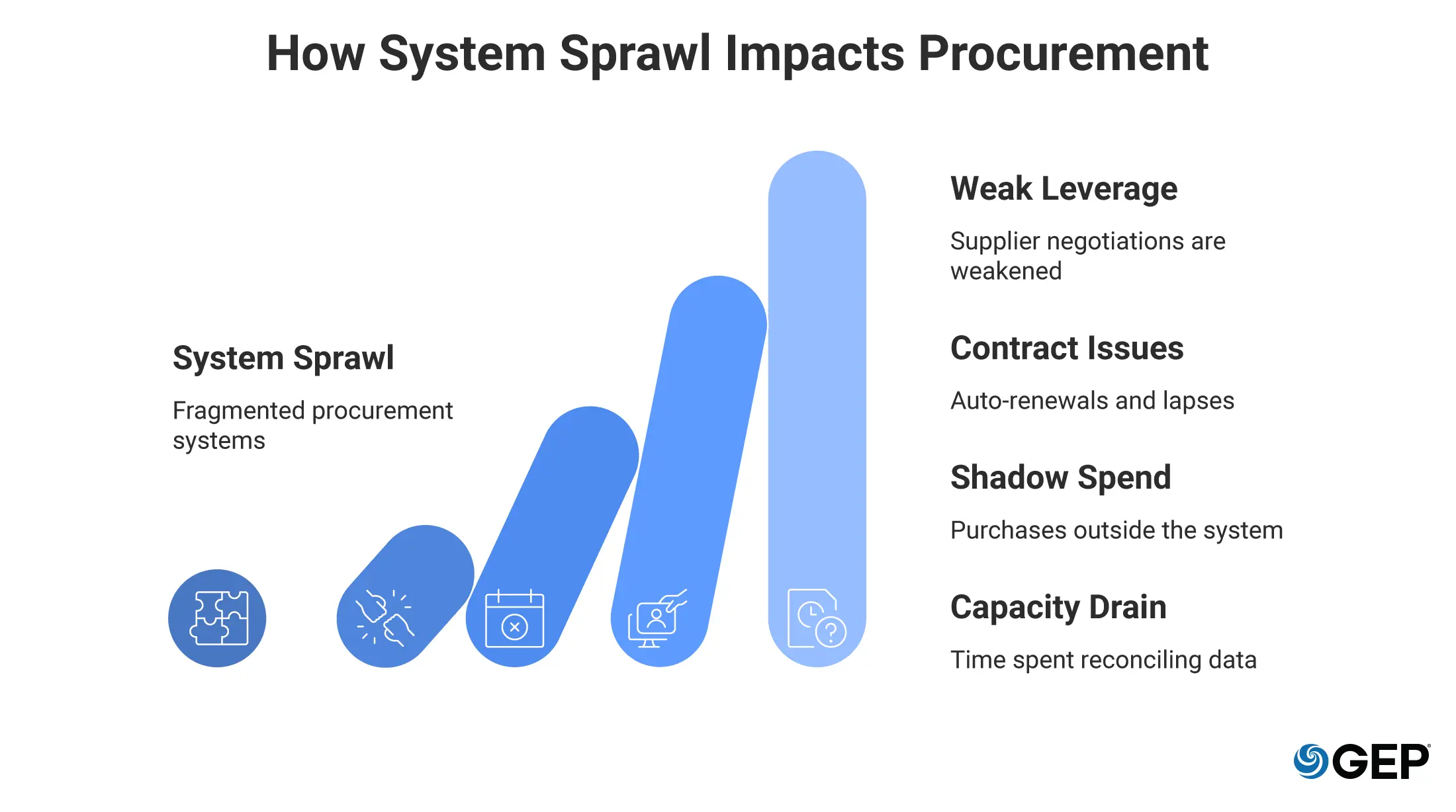 Start with negotiating leverage. In a fragmented environment, the same supplier frequently appears under multiple records across different systems. A business unit spending $2 million with a vendor and another spending $3 million in separate systems are both negotiating from a position of weakness. The leverage is there. The visibility to use it isn't.