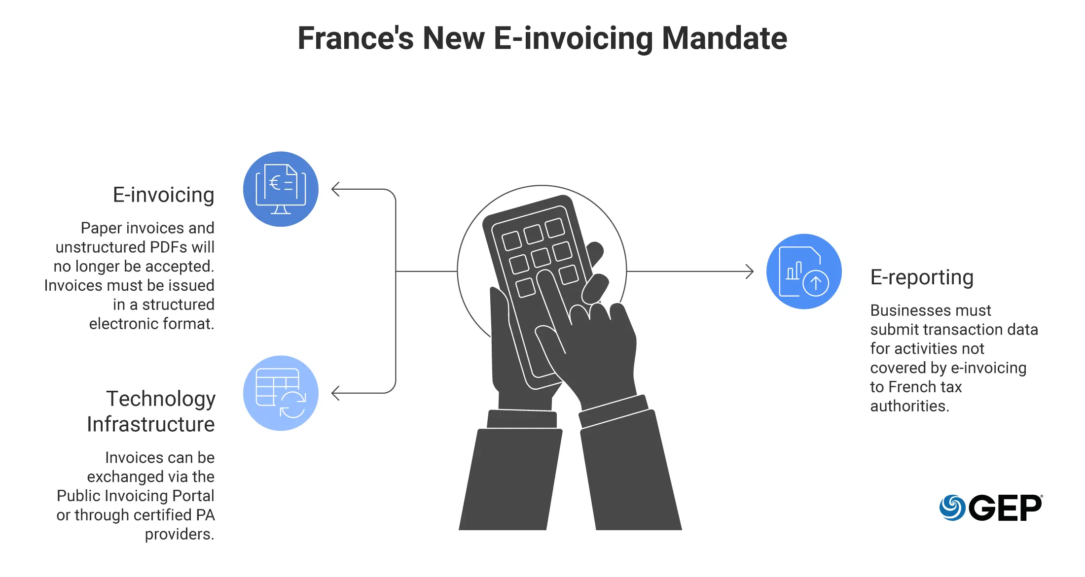 GEP delivers solutions for sending and receiving electronic invoices globally, not limited to the French mandate. Get up to speed on e-invoicing requirements worldwide using the E-Invoice Compliance Navigator, and explore current mandates in Belgium, Poland and Germany.