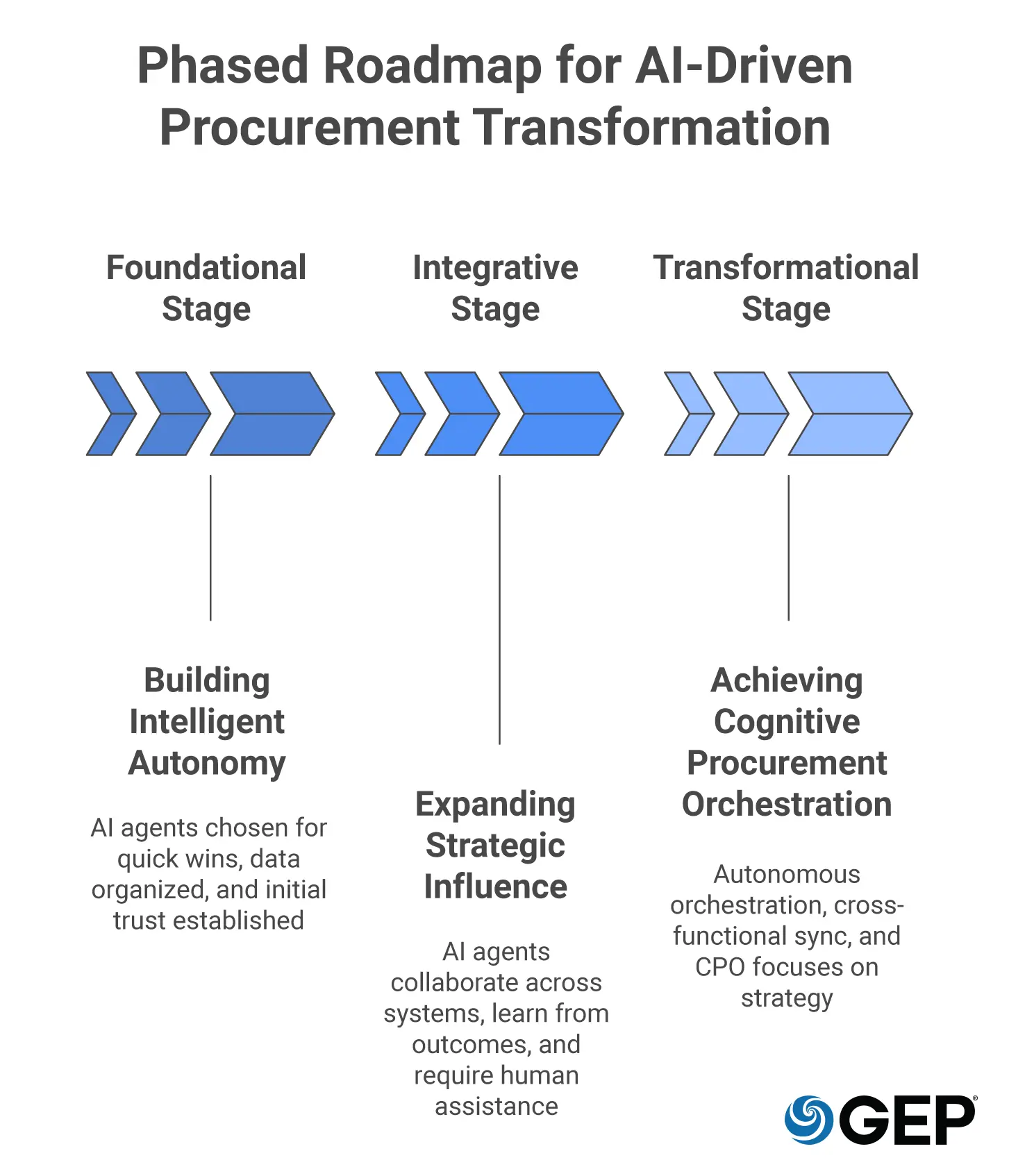 The foundational stage gives you an AI-ready procurement function with measurable returns from early deployments.