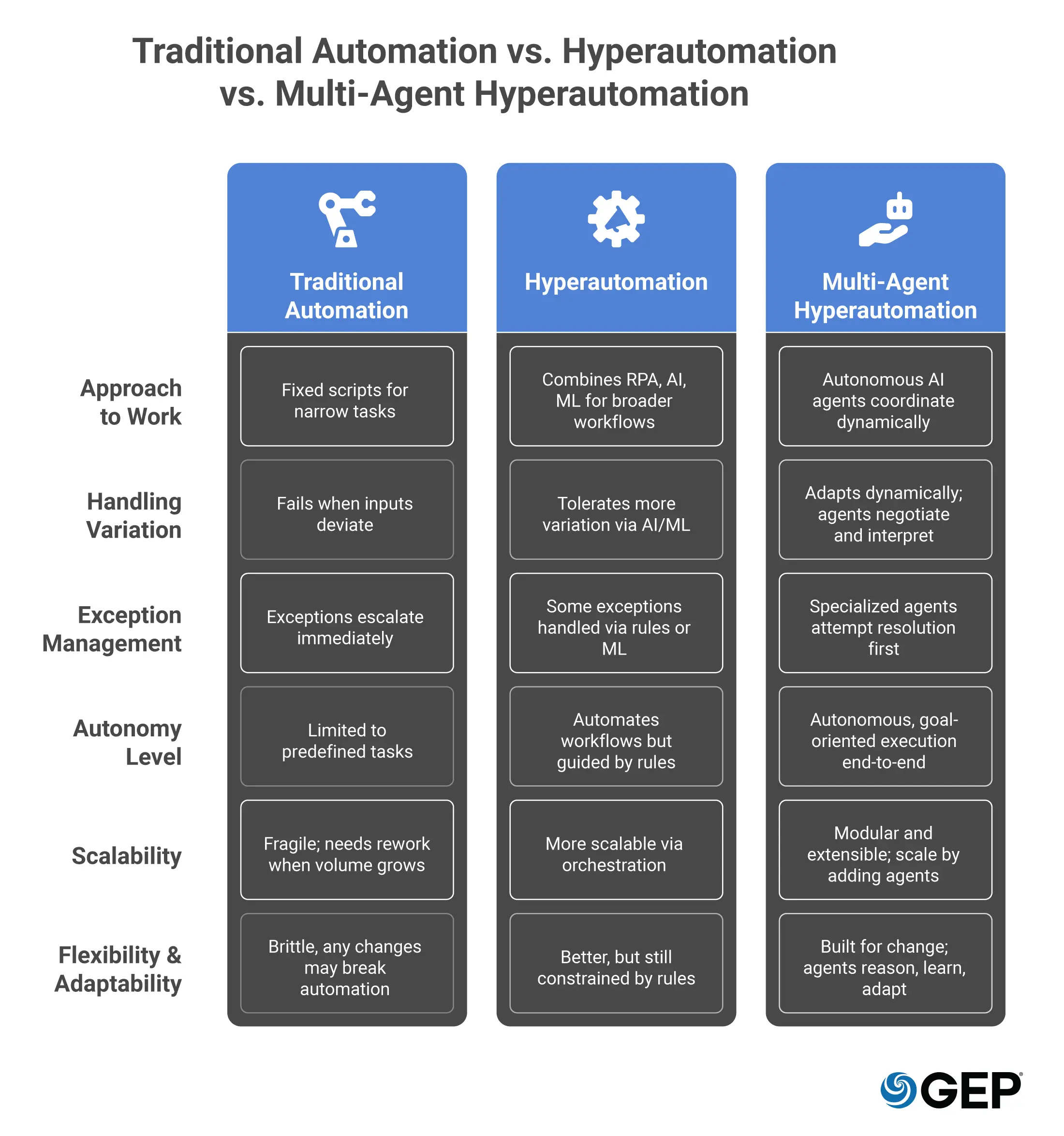 Multi-agent hyperautomation approaches the work differently. It uses several agents, each responsible for a specific task — understanding the document, standardizing the data, matching details, checking compliance, or handling exceptions. Using Retrieval-Augmented Generation (RAG), they can pull the latest policies and contract terms as they work, which keeps their decisions consistent with your rules.