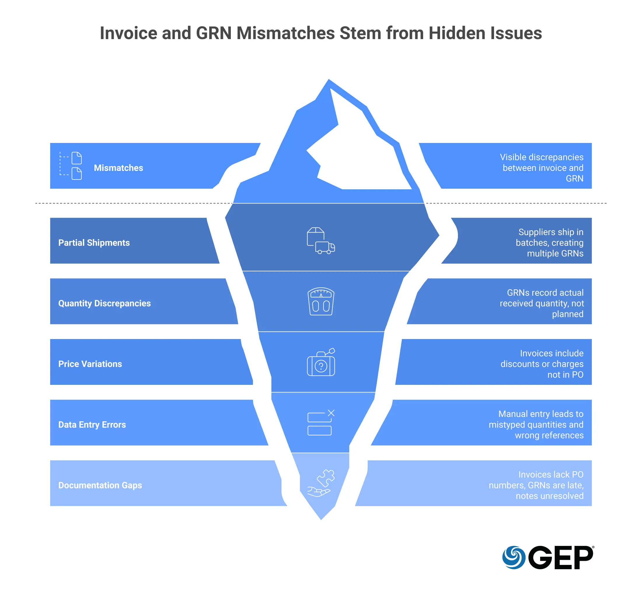 GRNs record what actually shows up. That number rarely matches what was planned or billed. Short shipments and rejected items widen the gap, and the mismatch surfaces the moment the invoice is processed.