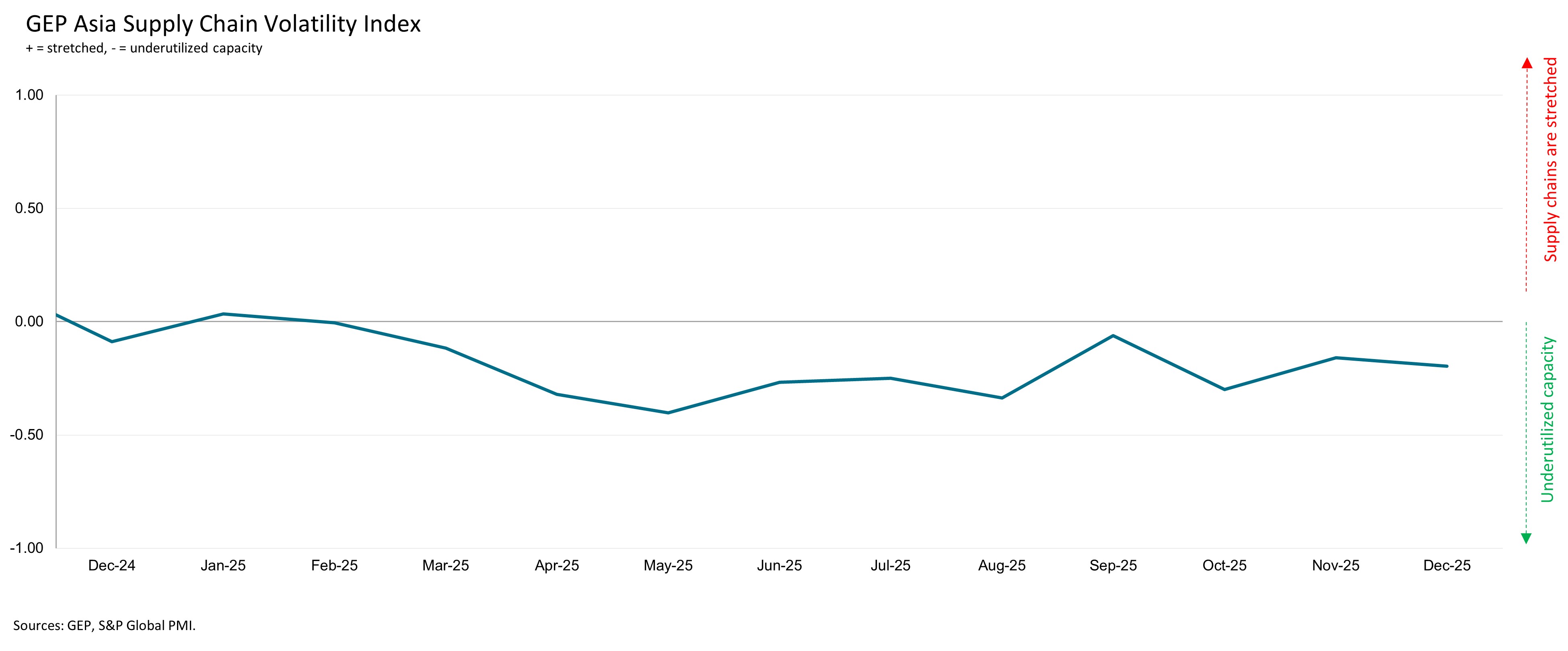 A value below 0 indicates that supply chain capacity is being underutilized, reducing supply-chain volatility. The further below 0, the greater the extent to which capacity is being underutilized.