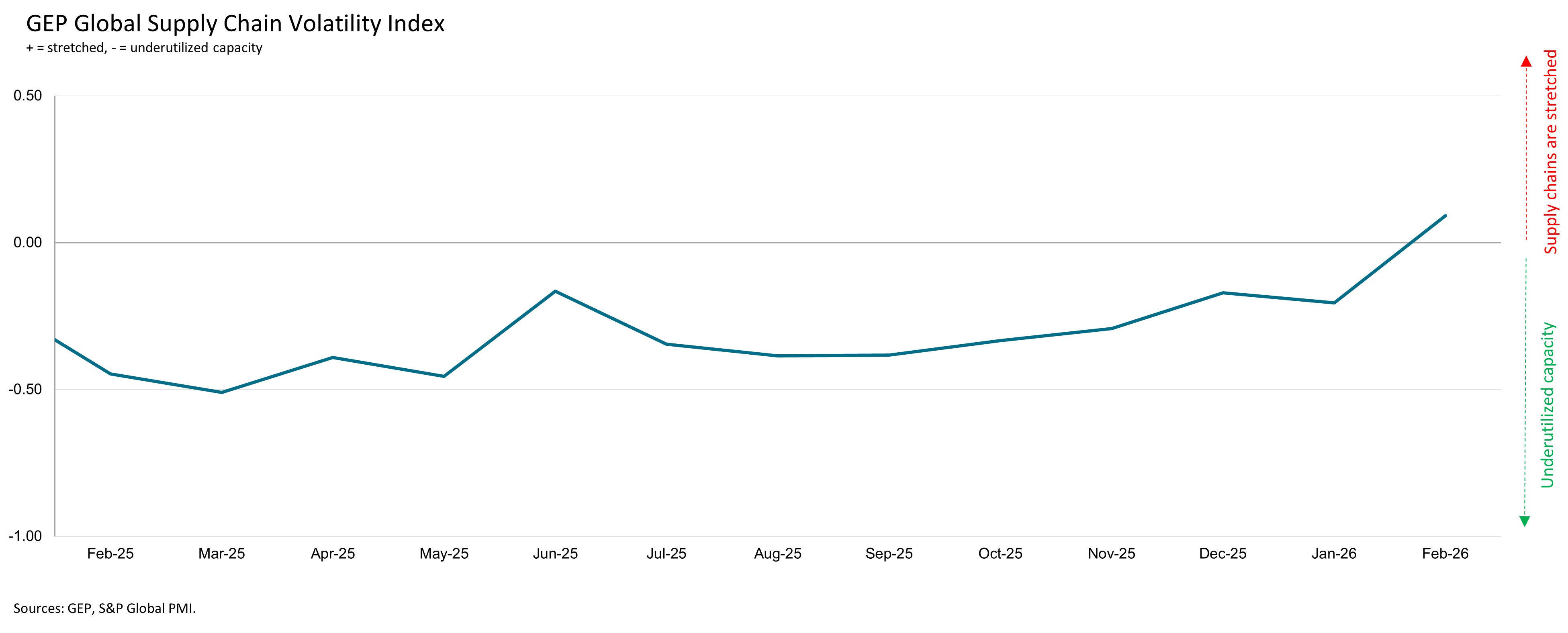 Clark, N.J., March 11, 2026 — GEP Global Supply Chain Volatility Index — a leading indicator tracking demand conditions, shortages, transportation costs, inventories and backlogs, based on a monthly survey of 27,000 businesses — showed that worldwide purchases of raw materials, commodities and critical components rose at the fastest pace in almost four years. Underlying data suggest the upturn was broad-based across sectors, with procurement activity rising in both capital-intensive and consumer-facing industries, pointing to a cyclical upswing prior to the war in the Middle East.