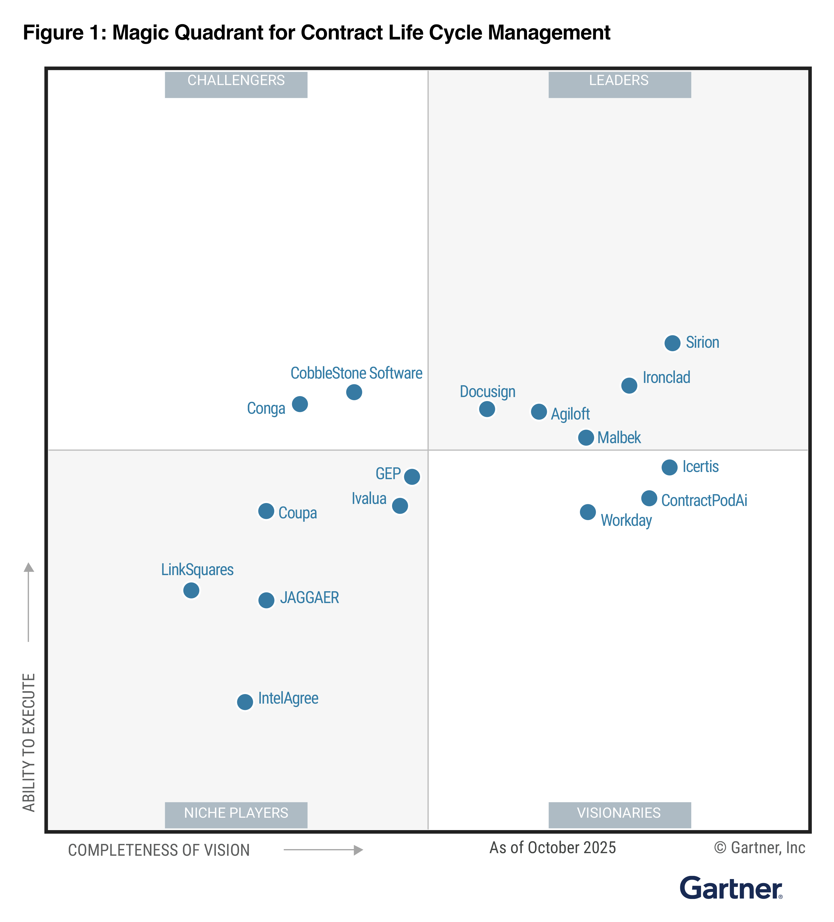 The Contract Lifecycle Management (CLM) solutions landscape is evolving fast. The Gartner Magic Quadrant™ for Contract Lifecycle Management provides a detailed view of the market’s providers, assessing their vision, innovation, ability to execute and more.