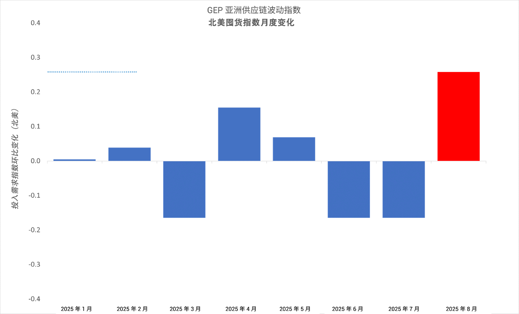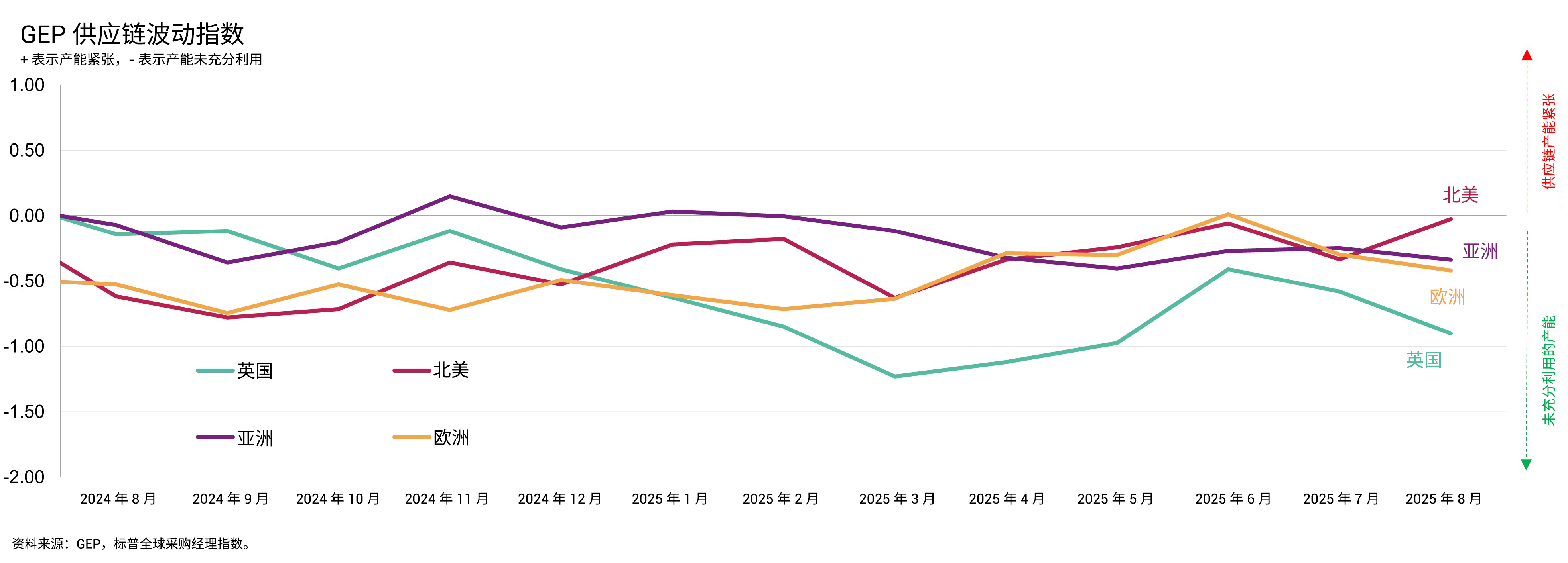 新泽西州克拉克市,2025 年 9 月 11 日 – GEP 全球供应链波动指数, (基于对 27,000 家企业月度调查的领先经济指标)8 月降至 -0.39,较 7 月的 -0.35 进一步下滑,表明全球供应链活动趋冷之际闲置产能正在上升